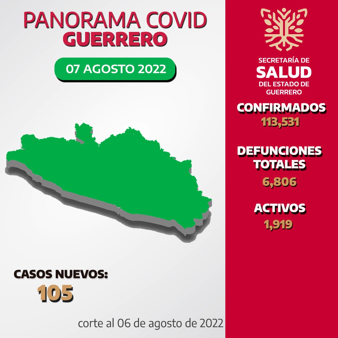 Chilpancingo, Gro., 07 de agosto 2022.- El Estado de Guerrero registra 1,919 casos activos de COVID-19, de los cuales 105 y 2 defunciones se confirmaron en las últimas 24 horas, informó la Secretaría de Salud Guerrero (SSG).