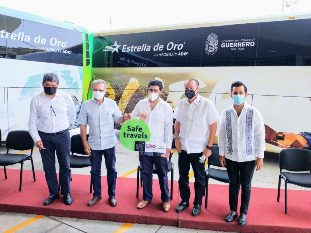 A nombre del gobernador Héctor Astudillo Flores, el Secretario de Salud, Carlos de la Peña Pintos entregó al Gerente General de Estrella de Oro, José Miguel Díaz Hernández, el sello Safe Travels, acompañado por el Secretario de Turismo, Ernesto Rodríguez Escalona y el Presidente del Fideicomiso de Promoción Turística, Eligio Serna y el Director Operativo del Fidetur, Daniel Torres.