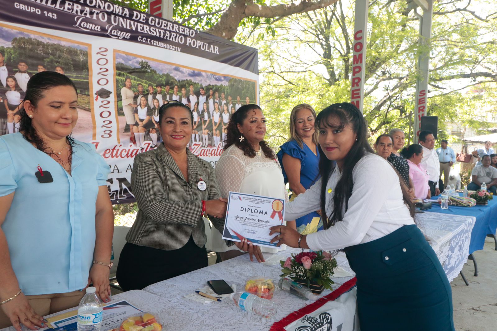 Acapulco, Gro., 20 de julio de 2023. La presidenta municipal, Abelina López Rodríguez, presidió la ceremonia de clausura de la generación 2020-2023 “Leticia Lozano Zavala”, en la Escuela Preparatoria Popular Extensión Loma Larga, ubicada en el poblado Carabalí, lugar que ha sido beneficiado por las gestiones que el gobierno de Acapulco ha realizado a lo largo de su administración.