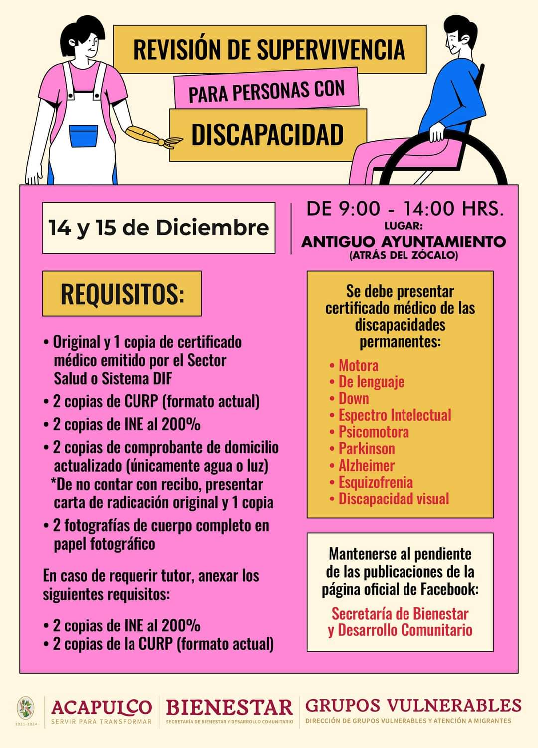 Acapulco, Gro., 11 de diciembre de 2023.- El gobierno que encabeza la Presidenta Municipal, Abelina López Rodríguez, a través de la Secretaría de Bienestar y Desarrollo Comunitario, que dirige Leticia Lozano Zavala, invita a las y los beneficiarios del Programa de Apoyo para Personas con Discapacidad (PROAPDIS) a realizar el trámite de revisión de supervivencia.