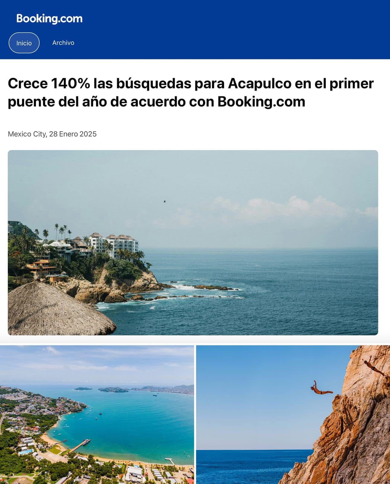 Acapulco, Gro., 31 de enero de 2025.- Acapulco se posiciona en la preferencia de los turistas como la mejor opción para pasar el primer fin de semana largo del 2025; de acuerdo al sitio especializado en turismo, Booking.com, este destino guerrerense aparece en primer lugar de búsquedas para pasar los días de asueto en conmemoración del Día de la Constitución, por arriba de opciones como Guadalajara, Puerto Vallarta, Playa del Carmen y Cancún.