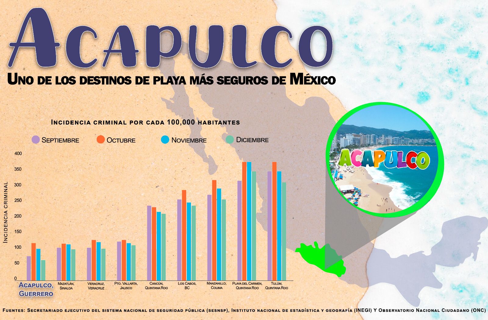 Chilpancingo, Gro. 3 de marzo del 2025.- El puerto de Acapulco es uno de los destinos de playa más seguros de México, de acuerdo con datos del Instituto Nacional de Estadística y Geografía, el Secretariado Ejecutivo del Sistema Nacional de Seguridad Pública, y el Observatorio Nacional Ciudadano.