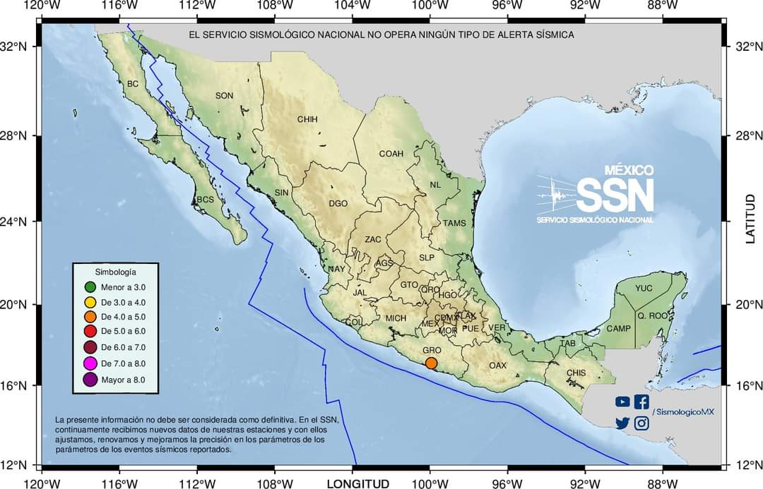 Personal operativo se mantiene atento ante cualquier incidencia que pudiera ser reportada por la población; el Servicio Sismológico Nacional informó que este fenómeno registró una magnitud de 4.6 grados en la escala de Richter; hasta el momento no se registran afectaciones.