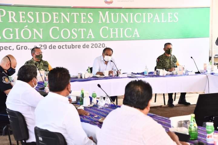 Ometepec, Gro.- Con la finalidad de cerrar filas en las acciones para mitigar la pandemia, los contagios del Covid-19, y continuar fortaleciendo la seguridad en esa zona, el gobernador Héctor Astudillo Flores, acompañado de los comandantes de la Novena Región Militar, Eufemio Ibarra Flores y de la 27 zona Militar, Federico San Juan Rosales, sostuvieron una reunión de trabajo con la y los presidentes municipales de la Costa Chica.