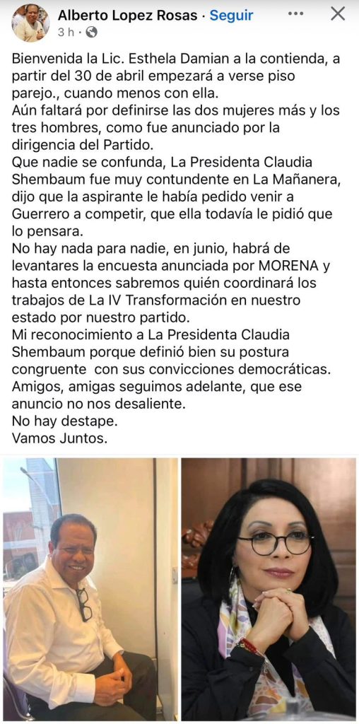 El mensaje de López Rosas puede leerse como un intento por sostener el principio de “piso parejo” dentro de la contienda, al tiempo que mantiene vigente su propia aspiración. Sin embargo, también evidencia la tensión entre el discurso institucional de apertura y las sospechas de favoritismo que suelen acompañar los procesos internos del partido.