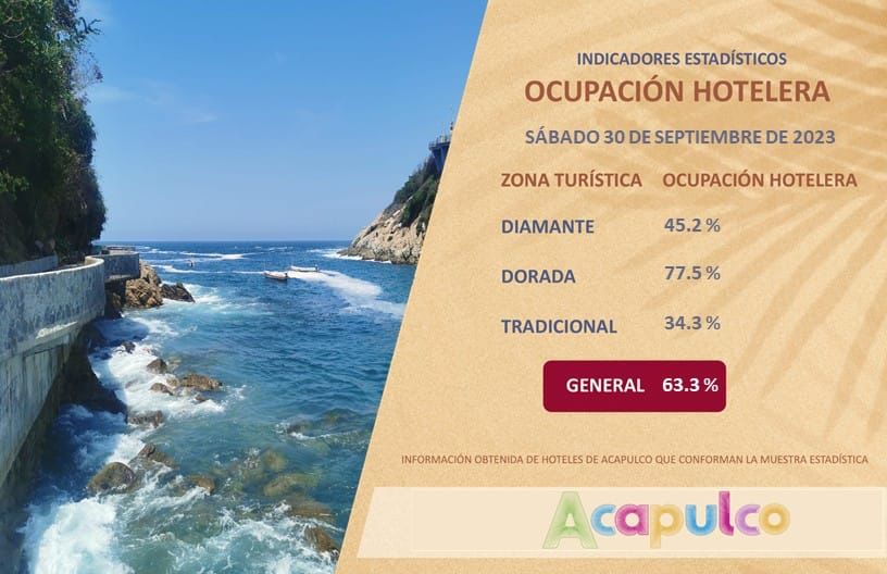 Acapulco, Gro., 30 de septiembre de 2023.- El Gobierno Municipal que encabeza Abelina López Rodríguez, a través de la Secretaría de Turismo Municipal, informa que este sábado las hospederías del puerto de Acapulco registraron un 63.3 por ciento de ocupación hotelera en el promedio general.
