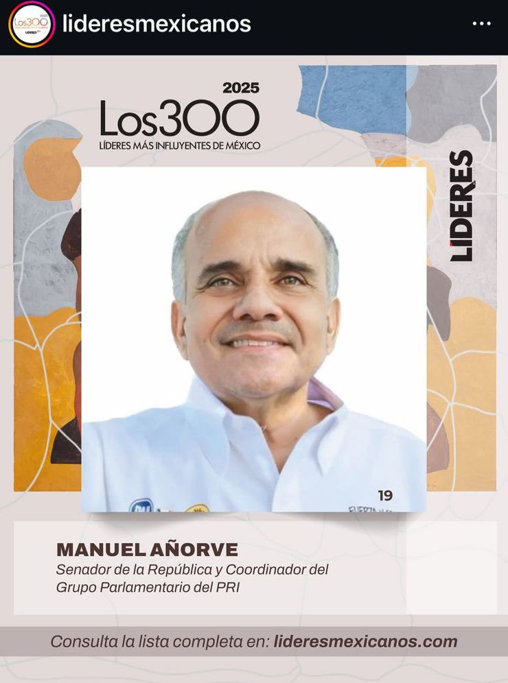 CDMX, a 18 de julio de 2025.- El coordinador del Grupo Parlamentario del PRI en el Senado de la República, Manuel Añorve Baños, volvió a aparecer en el listado que hace la revista Líderes Mexicanos, en la que figuran 300 personas entre políticos, deportistas, comunicadores, empresarios, etc.