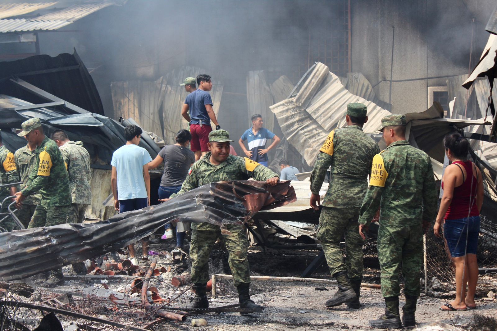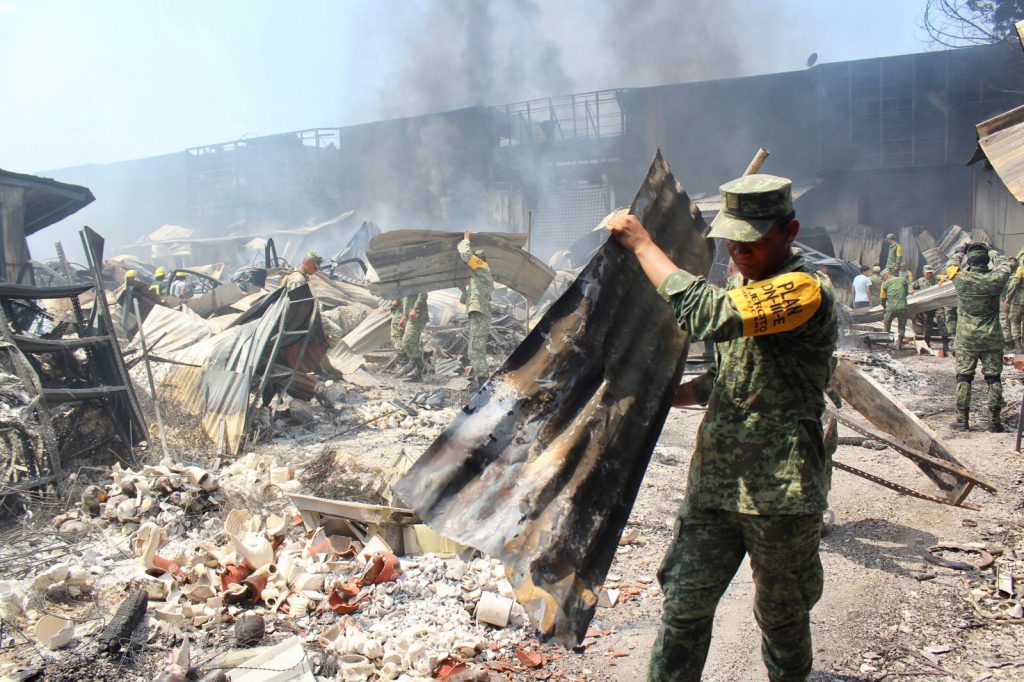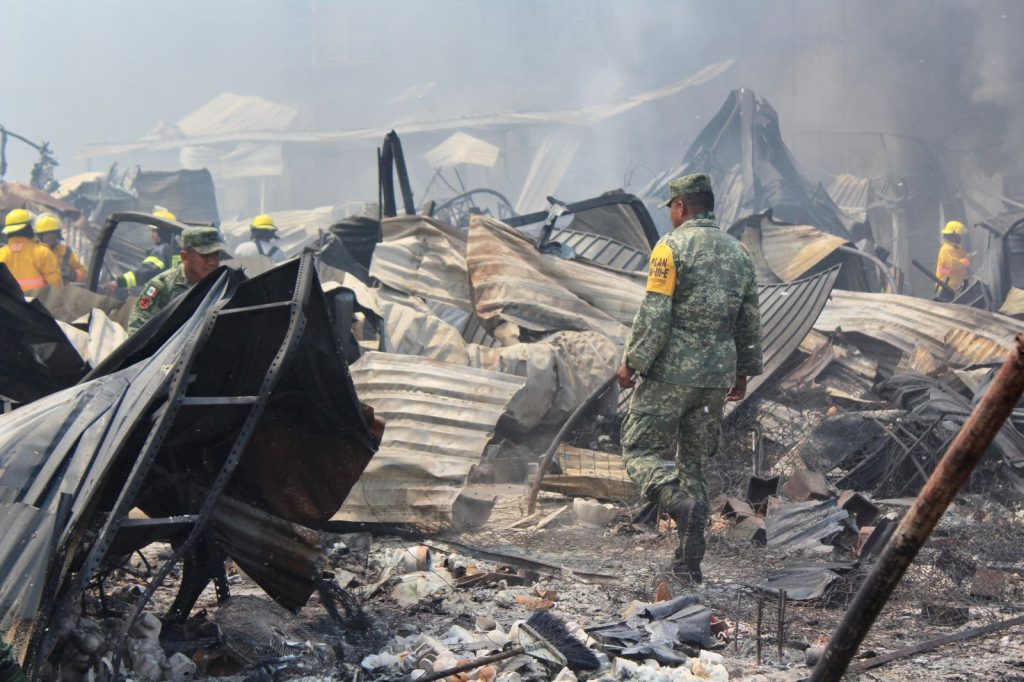 Los elementos que forman parte de la IX región militar desde las primeras horas de este lunes, comenzaron a trabajar en conjunto con las autoridades municipales y estatales y después de que fuera sofocado parte del incendio, comenzaron con los trabajos de remoción de escombro.