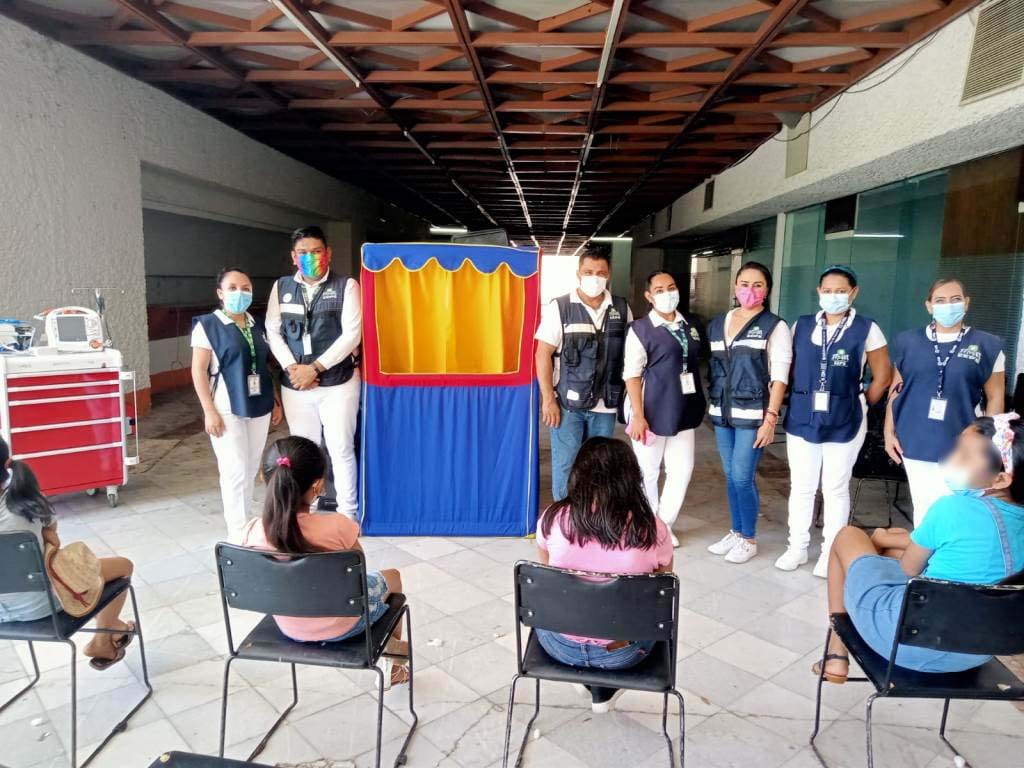 Este 14 y 15 de julio, en Acapulco, el personal se suma a la estrategia de vacunación en la sede del Centro Internacional Acapulco, en donde además los promotores de salud y trabajo social realizan actividades lúdicas, como teatro guiñol, de TeatrIMSS.