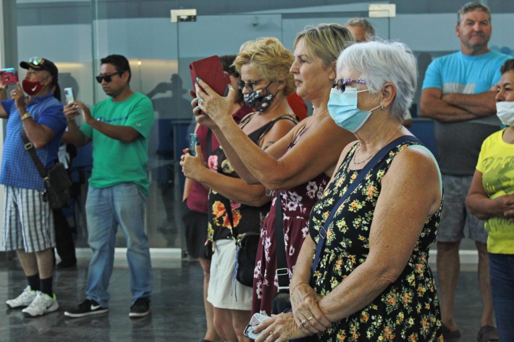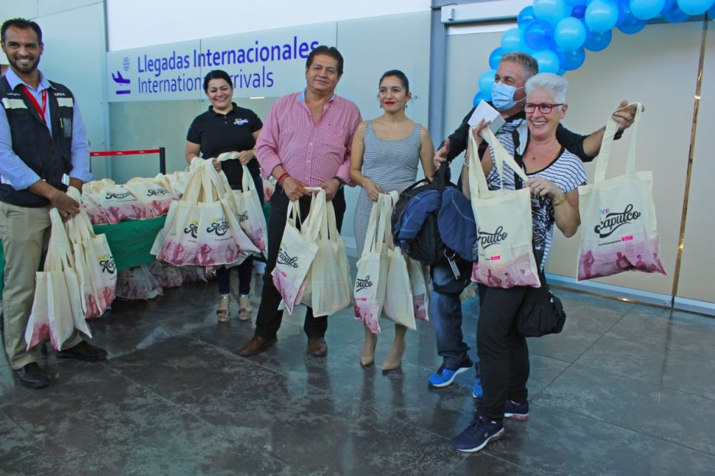 El secretario de Turismo Municipal, David Abarca Rodríguez, junto al Ingeniero, Luifil Orlando Brito Navarro, Administrador del Aeropuerto Internacional de Acapulco, Aida Pérez Pérez, directora operativa de FIDETUR y Sergio Palacios, director de Promoción Internacional de Sectur Guerrero, recibieron y dieron la bienvenida a los primeros pasajeros canadienses provenientes de la aerolínea Airtransat.