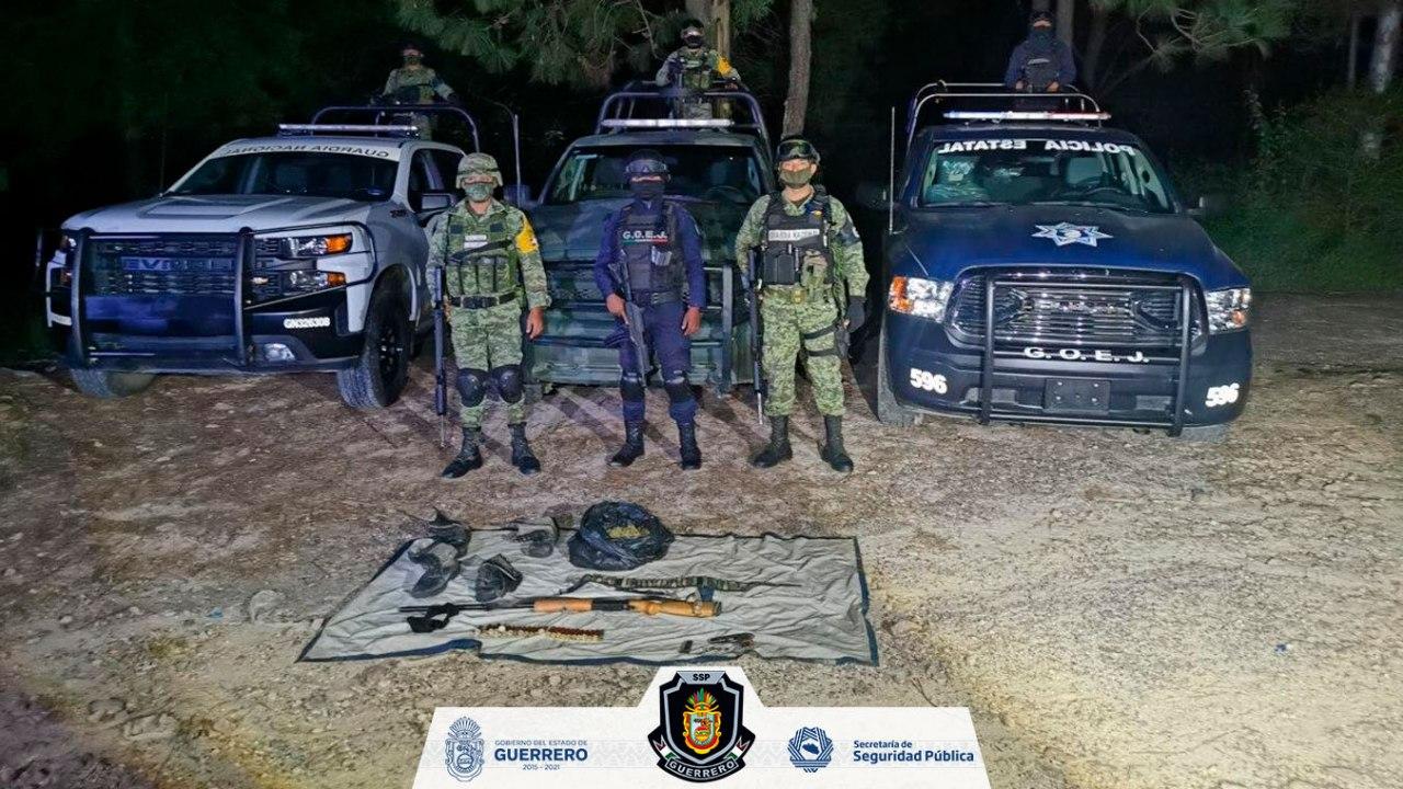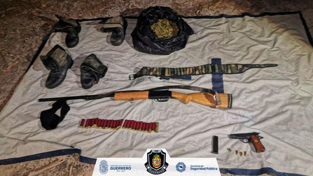 Chilpancingo, Guerrero, 14 de octubre de 2020.- En acciones conjuntas, elementos del Grupo de Operaciones Especiales “Jaguar”, Ejército Mexicano y Guardia Nacional aseguraron armamento, presunta droga, un par de botas tipo militar y una carrillera en el municipio de Taxco de Alarcón.