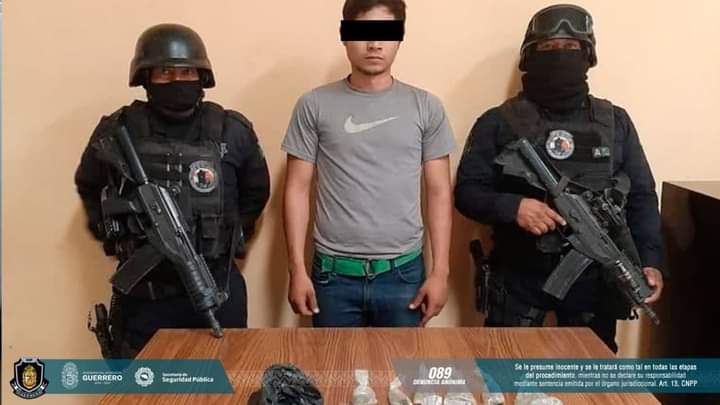 Chilpancingo, Guerrero, 10 de febrero de 2021.- Al realizar recorridos de prevención del delito por calles de la ciudad de Iguala, agentes del Grupo Táctico de Reacción Inmediata “Centauro” detuvieron a un individuo con presunta droga.