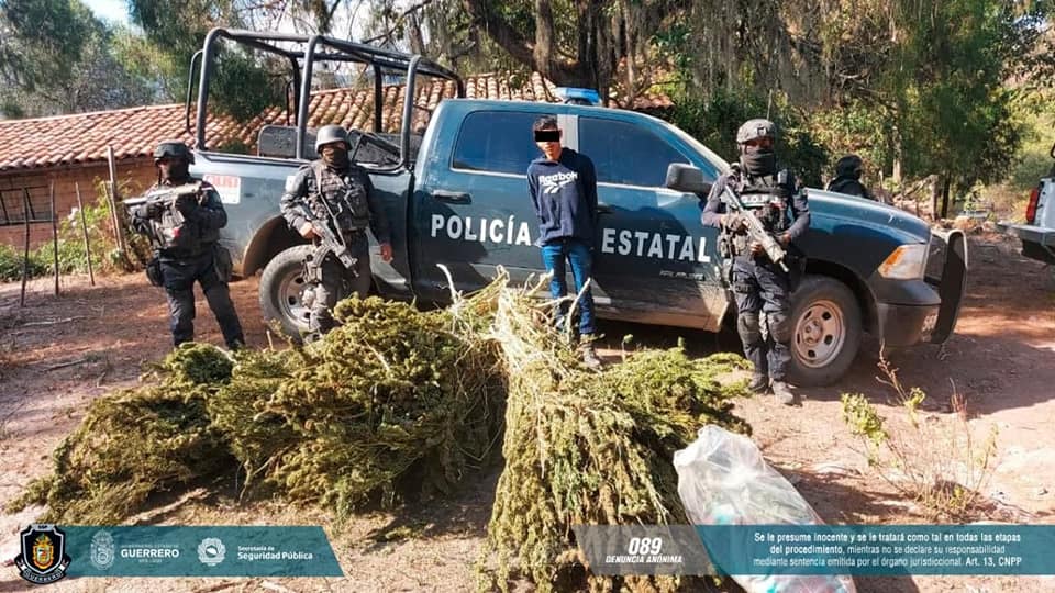 Chilpancingo, Guerrero, 11 de enero de 2021.- Como resultado de recorridos de vigilancia y prevención del delito, elementos del Grupo de Operaciones Especiales “Jaguar” y de la Policía Estatal aseguraron a un individuo y presunta droga en el municipio de Tetipac.