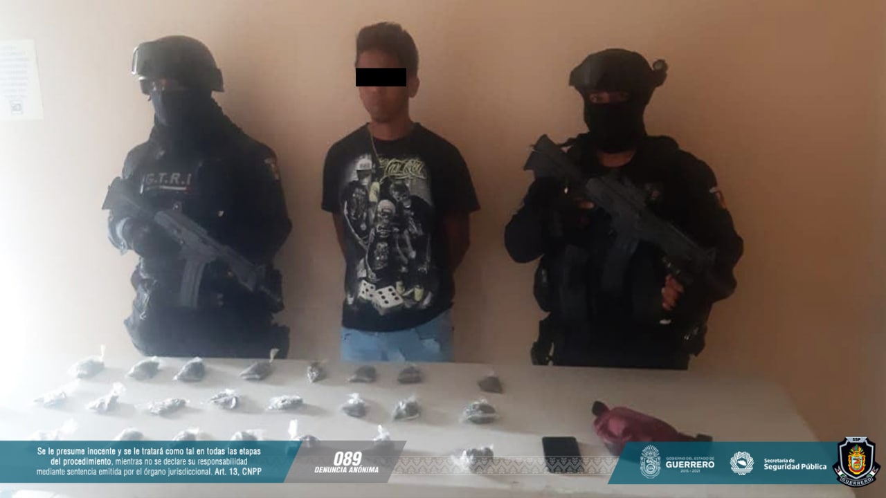 Chilpancingo, Guerrero, 15 de enero de 2021. – Como resultado de recorridos de seguridad por distintas colonias del municipio de Acapulco, elementos del Grupo Táctico de Reacción Inmediata “Centauro” de la Policía Estatal aseguraron a un individuo en posesión de presunta droga.