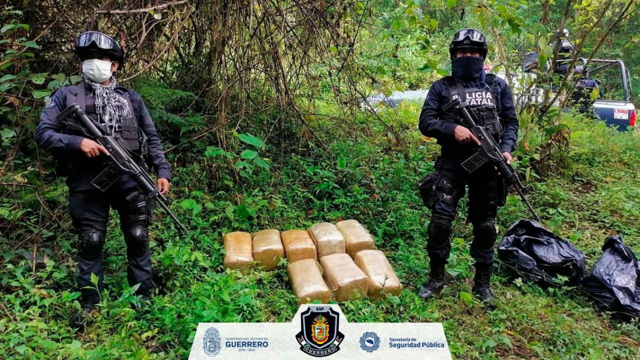 Chilpancingo, Guerrero, 05 de noviembre de 2020.- Elementos de la Policía Estatal aseguraron ocho paquetes con presunta droga en su interior en el municipio de Atoyac de Álvarez, en la región de la Costa Grande.