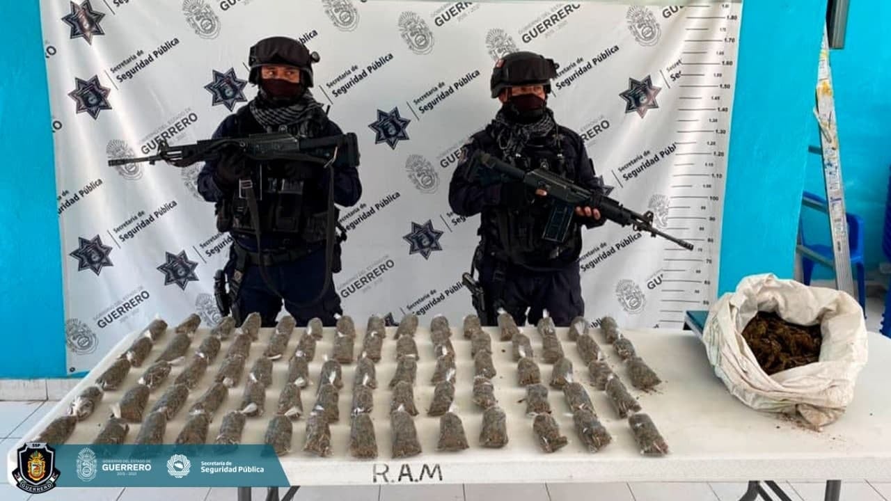 Chilpancingo, Guerrero, 04 de mayo de 2021.- Como resultado de patrullajes de seguridad, elementos de la Policía Estatal aseguraron presunta droga en la cabecera municipal de Coyuca de Catalán, en la región de la Tierra Caliente.