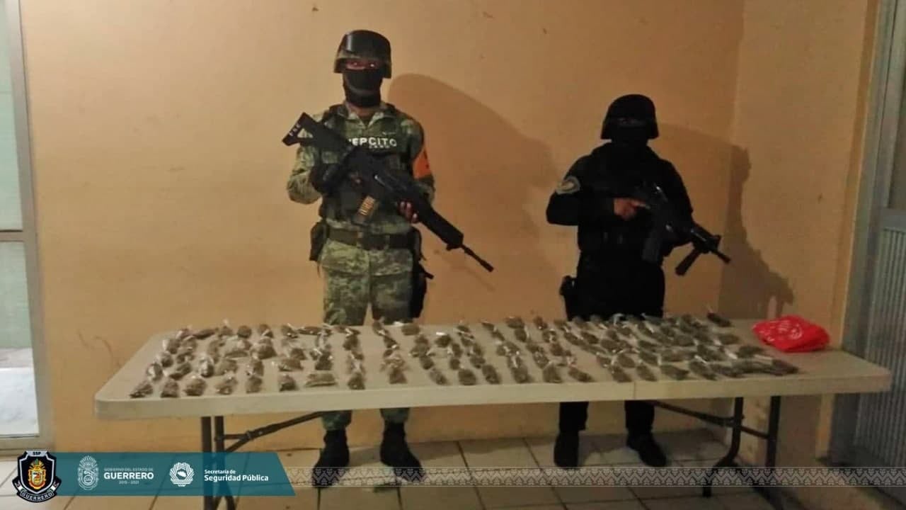 Chilpancingo, Guerrero, 23 de junio de 2021.- En dos hechos distintos, elementos de la Policía Estatal, en coordinación con personal de la Secretaría de la Defensa Nacional (SEDENA) y el Grupo Táctico de Reacción Inmediata “Centauro” aseguraron dosis de presunta droga en el municipio de Acapulco.