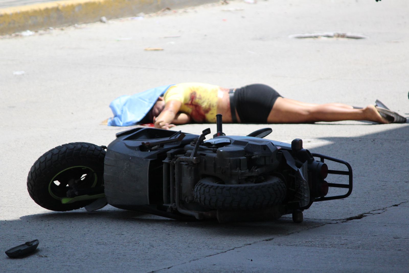 Se informó que la víctima, vestía una playera amarilla y bermuda negra fue encontrada tendida en el pavimento, boca abajo, y un par de metros más adelante una motocicleta.