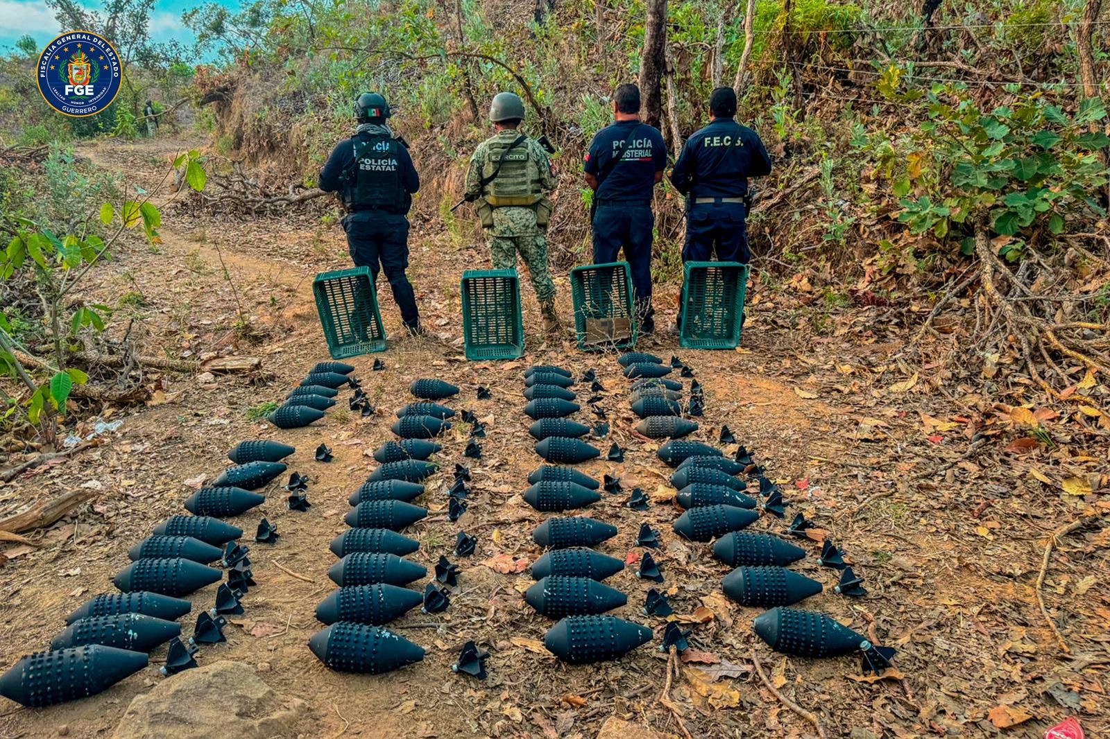 FGEGuerrero en coordinación con el Ejército Mexicano, Guardia Nacional y la Policía Estatal, asegura 51 artefactos explosivos, vehículos y localiza presunto campamento en Coyuca de Benítez.
