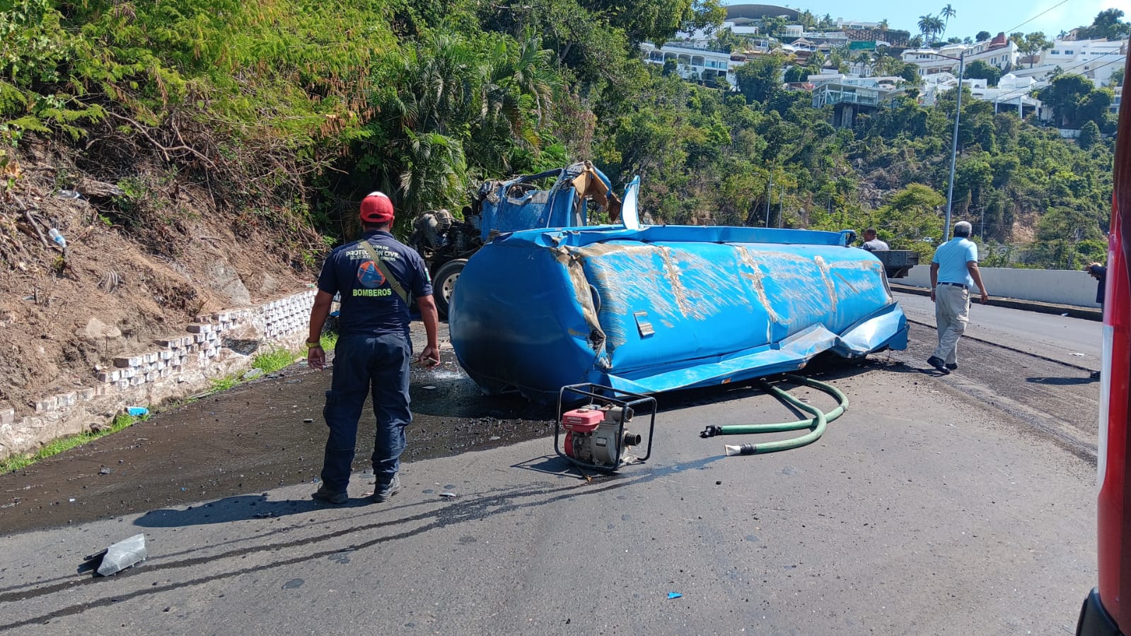 Personal de Protección Civil del estado realizan labores de limpieza y retiro de la pipa para reestablecer la vialidad, se pide a los automovilistas que circulan por la zona tomar precauciones.