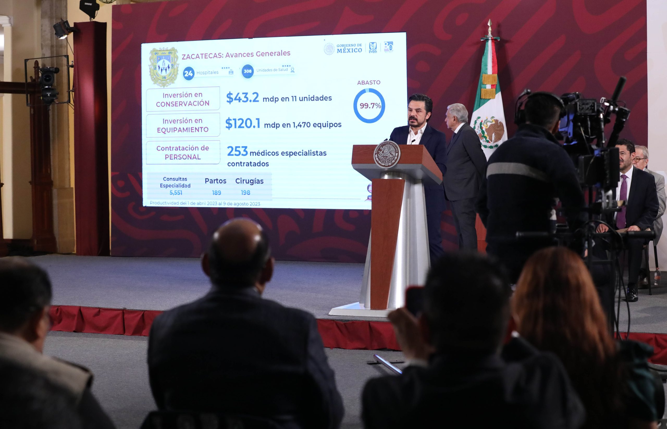 Indicó que en Hidalgo se invierten 985 mdp, 114 en infraestructura y 871 en la adquisición de equipo, se han enviado 304 médicas y médicos especialistas y recientemente inició operaciones el Hospital IMSS-Bienestar de El Valle de Metztitlán. El abasto reportado es de 99.8 por ciento.