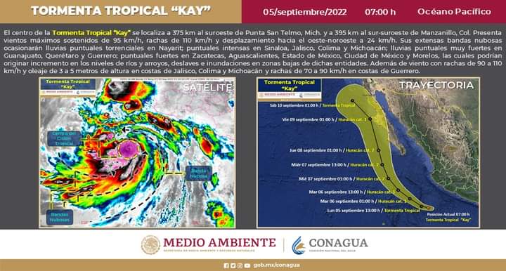 Acapulco, Gro., 05 de septiembre de 2022.– El Gobierno Municipal informa a la población que las extensas bandas nubosas de la tormenta tropical “Kay”, en interacción con un canal de baja presión sobre el occidente, centro y sur de México, ocasionarán lluvias muy fuertes en Guerrero y varios estados del país, las próximas horas.