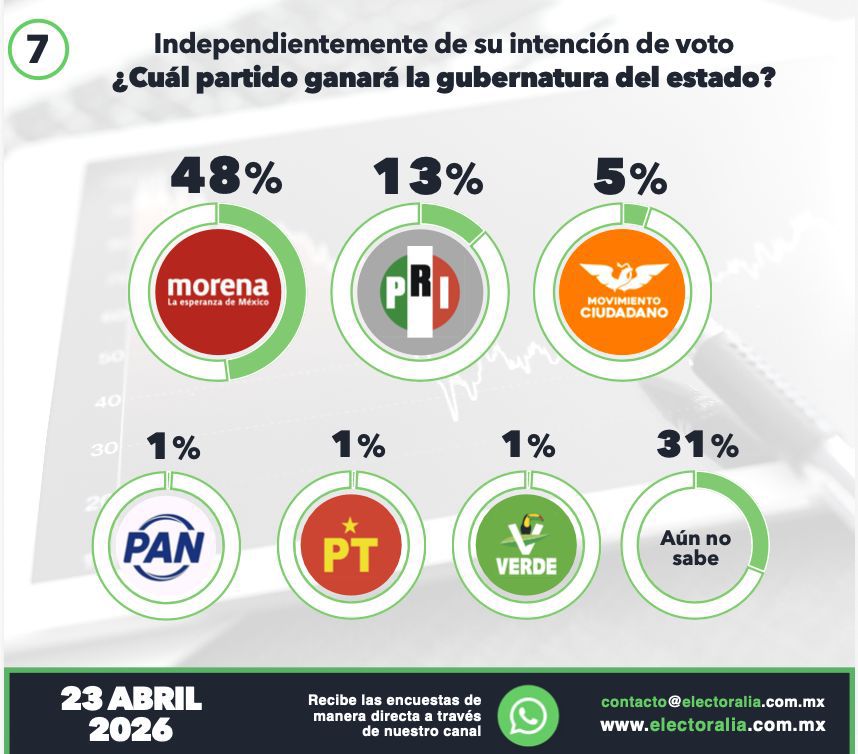 El estudio de Electoralia, levantado en abril de 2026 bajo el ejercicio “Rumbo 2027”, revela que Morena mantiene una ventaja clara en intención de voto con 47%, muy por encima de otras fuerzas políticas como el PRI (14%) y Movimiento Ciudadano (11%). En este contexto, la medición interna sobre la candidatura de Morena ubica a Beatriz Mojica con 37% de preferencia, colocándola en el primer lugar, seguida por Pablo Amílcar Sandoval con 24%, mientras que otros perfiles como Esthela Damián (6%), Abelina López (4%) e Iván Hernández (4%) se encuentran rezagados.