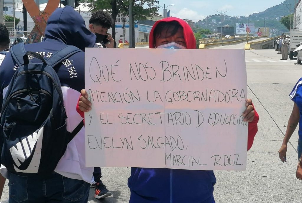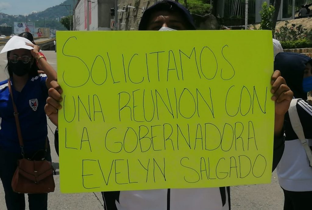 El grupo de aproximadamente 40 jóvenes con los rostros cubiertos y pancartas en mano, exigían una audiencia con la gobernadora Evelyn Salgado Pineda y con el secretario de educación, Marcial Rodríguez Saldaña para solicitar plazas para los estudiantes que concluyeron sus estudios en este último periodo.