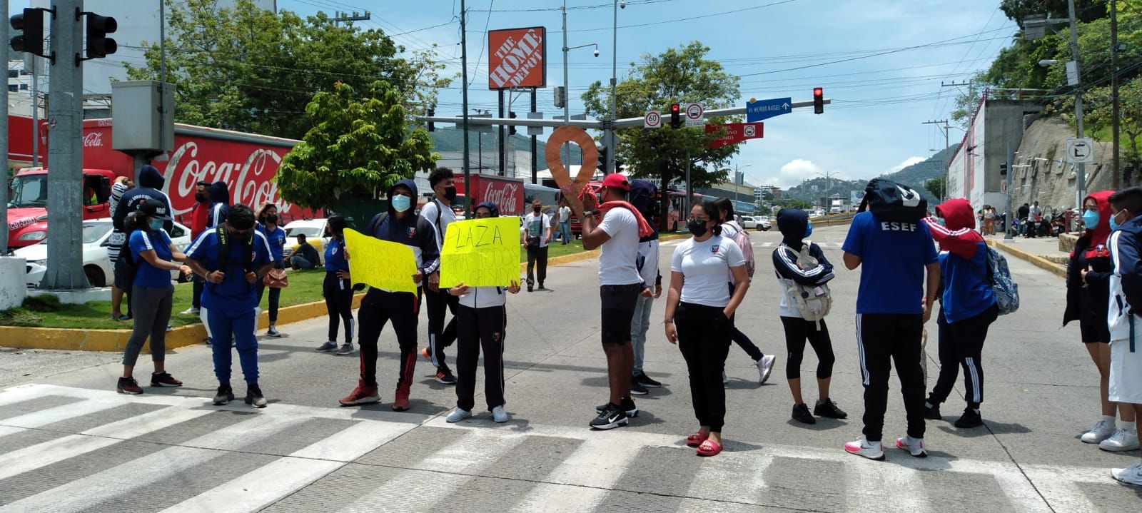 Acapulco,Gro., a 05 de julio del 2022.- Un grupo de estudiantes de la Escuela Superior de Educación Física (ESEF) en Acapulco, bloquearon de manera parcial la avenida Cuauhtémoc justo frente a las instalaciones del ayuntamiento municipal.
