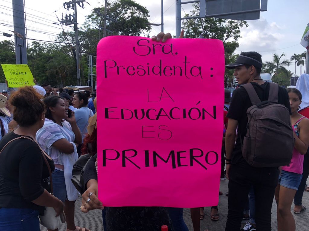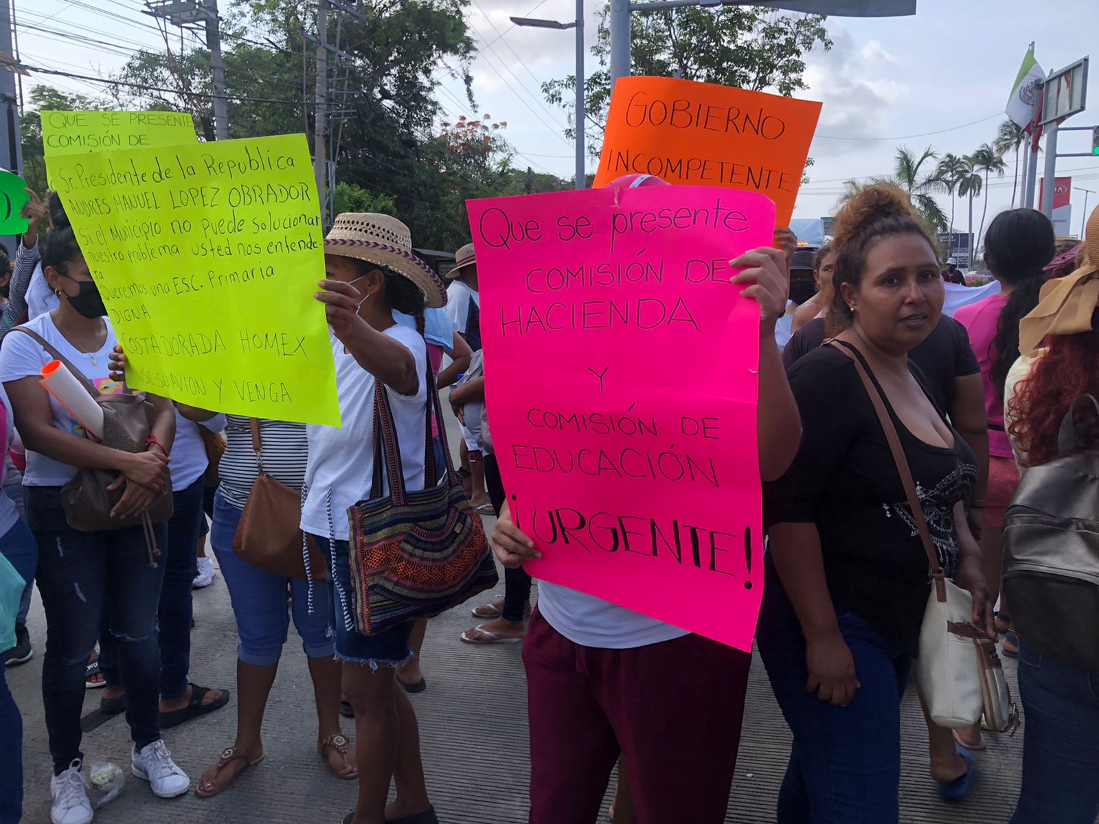 Maestros, prestadores de servicios turísticos y padres de familia de más de 9 escuelas de la zona escolar 44 en apoyo a la escuela Nueva Creación ubicada en el fraccionamiento Costa Dorada bloquearon ambos carriles del Bulevar de las Naciones, a la altura de la entrada de playa Revolcadero, arteria vehicular que conecta con el aeropuerto Juan N. Alvarez, en demanda a la donación de un predio para la construcción de un plantel educativo para 180 niños.