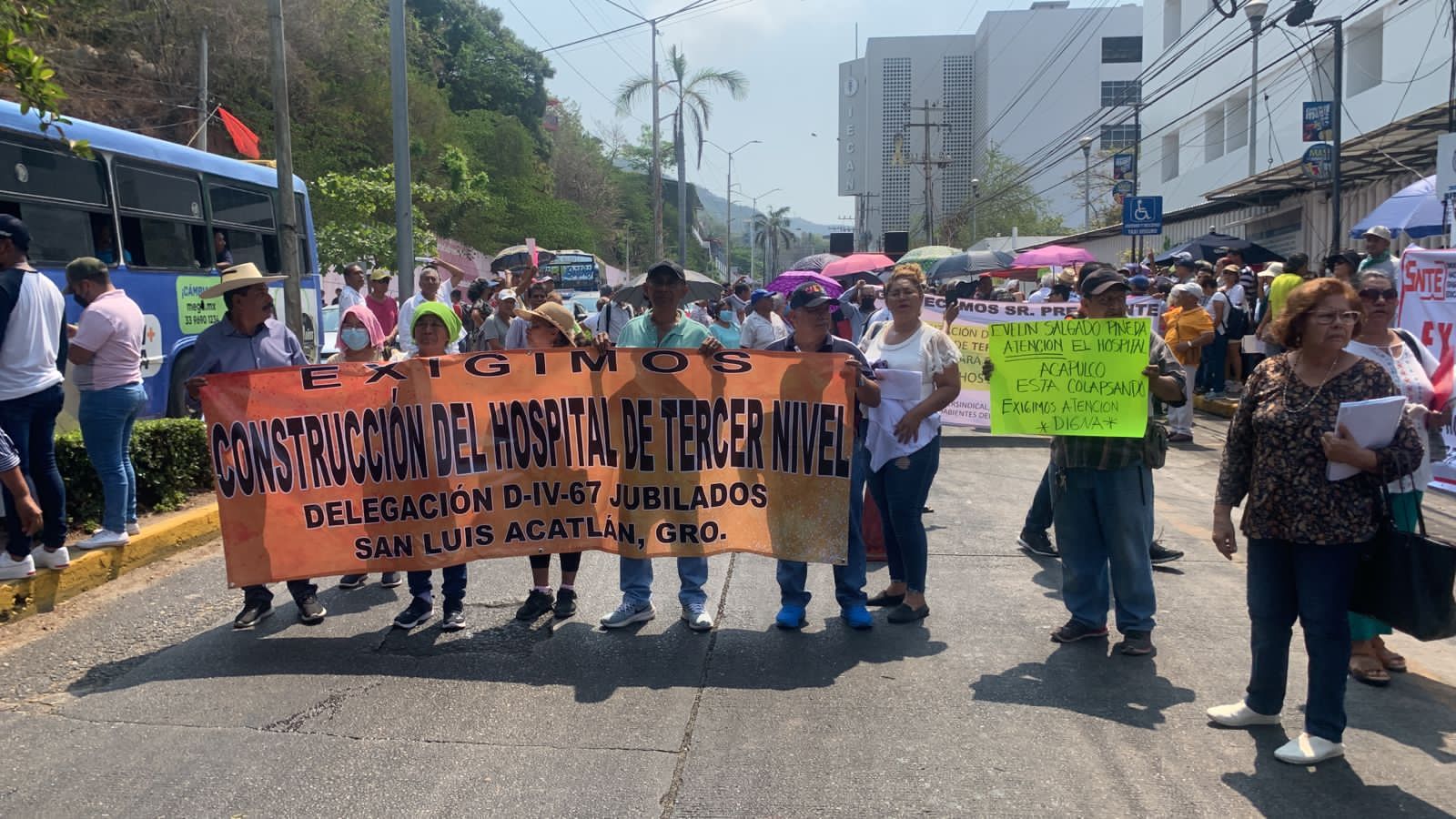 Acapulco,Gro., a 25 de mayo del 2023.-Integrantes de la Comisión Intersindical, miembros de distintas Asociaciones Civiles y Derechohabientes del ISSSTE realizaron un bloqueo sobre el carril de la avenida Ruiz Cortines en la denominada zona de hospitales para exigir se les dé fecha de inicio a la construcción del hospital de tercer nivel.