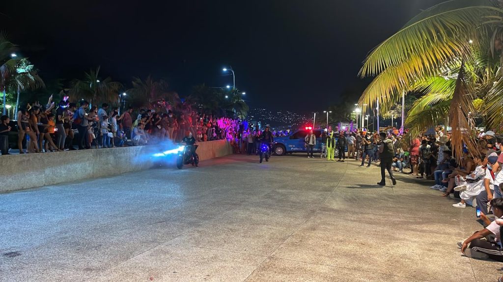 Acapulco, Gro., 01 de noviembre del 2021.-Elementos de la Policía Turística, resguardaron un tramo de la Costera Miguel Alemán por un espectáculo conmemorativo al Día de Muertos que realizó la Asociación de Motociclistas “Los Waches”, la noche del domingo.
