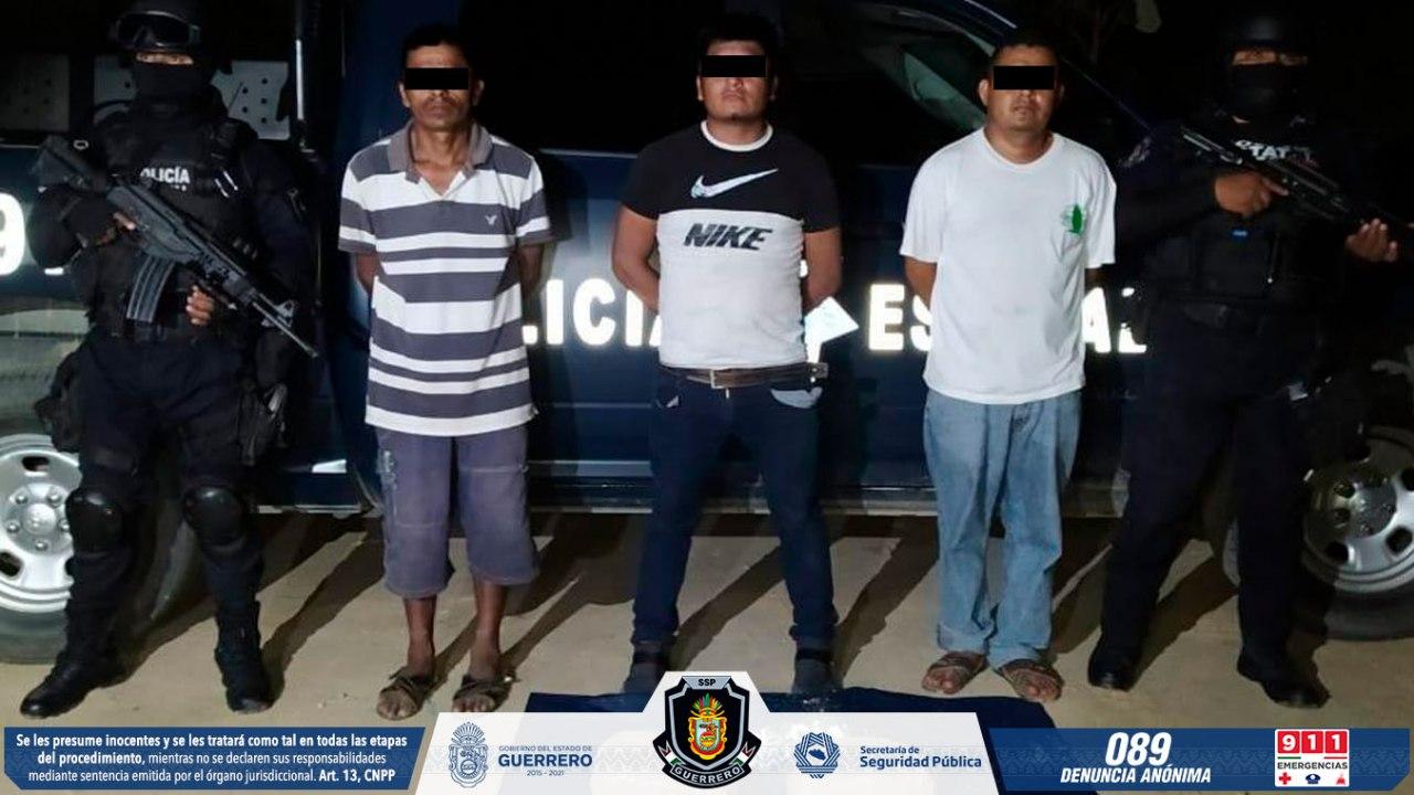 Chilpancingo, Guerrero, 29 de octubre de 2020.- Elementos de la Policía Estatal aseguraron a tres masculinos en posesión de dos paquetes con presunta marihuana, como resultado de recorridos de prevención del delito en la cabecera municipal de Ometepec.