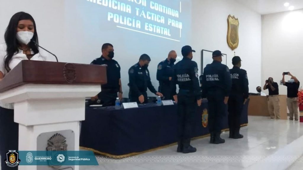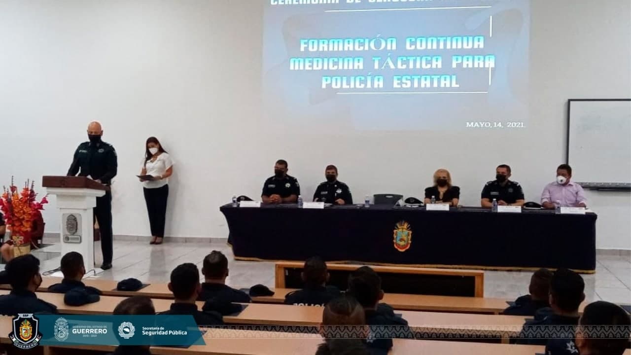 Chilpancingo, Guerrero, 17 de mayo de 2021.- Continuando con la profesionalización permanente de los elementos que integran a la Policía Estatal, el Secretario de Seguridad Pública de Guerrero, David Portillo Menchaca clausuró y entregó las constancias de terminación del Curso de Medicina Táctica.