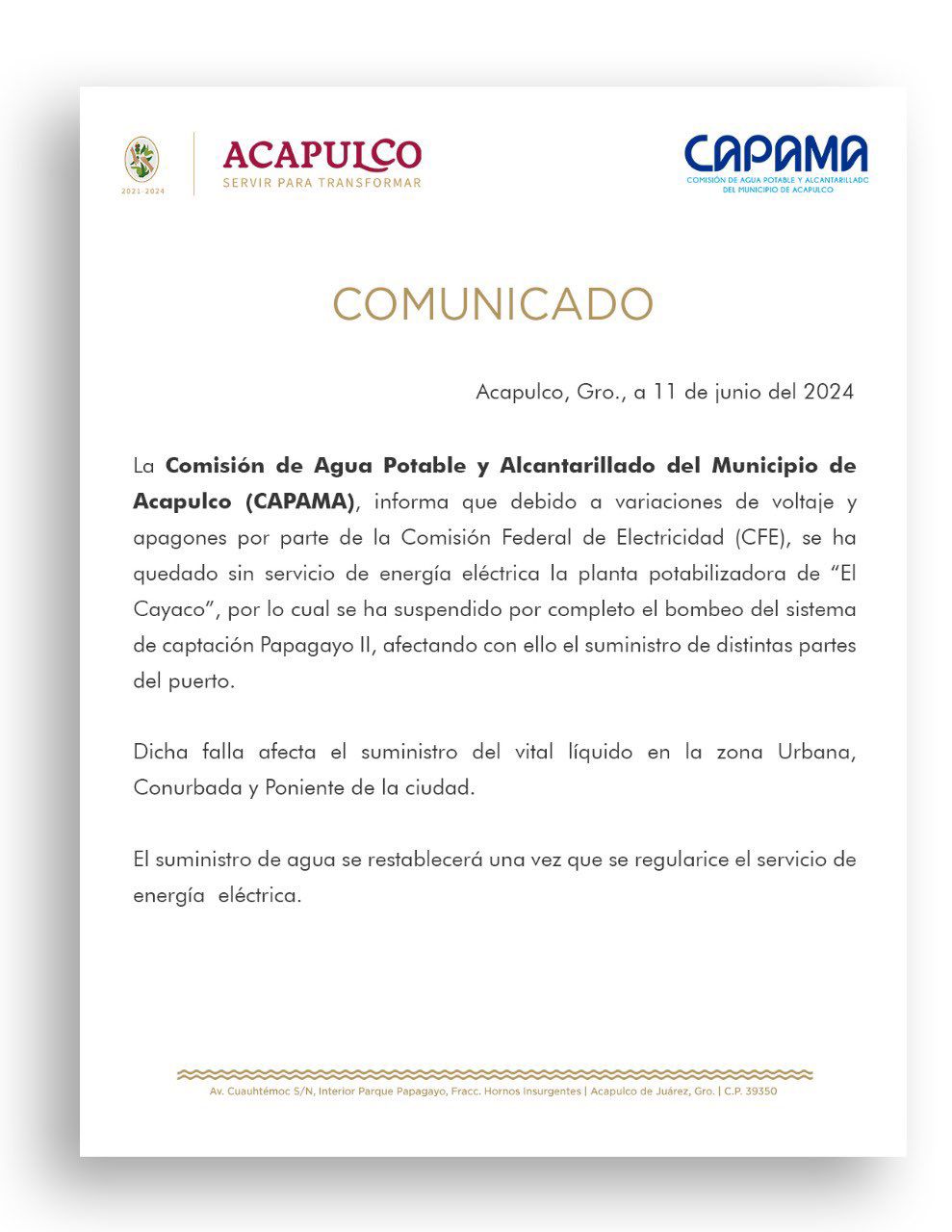 En el comunicado; se destaca que la falta del vital líquido se debe a una variaciones en el voltaje y apagones constantes por parte de la Comisión Federal de Electricidad (CFE).