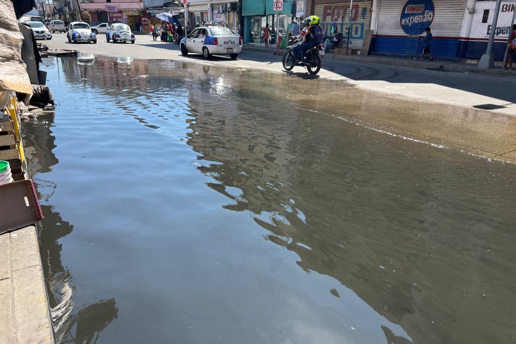 El encharcamiento de agua se aprecia sucio, maloliente y salen disparados cuando algún vehículo avanza a alta velocidad, cayendo sobre los ciudadanos la que caminan por el lugar.