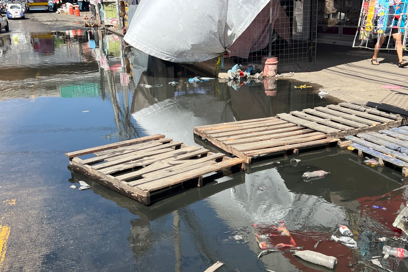 Algunos vendedores optaron por colocar algunas piezas de madera para poder avanzar y no mojarse para cruzar la calle.
