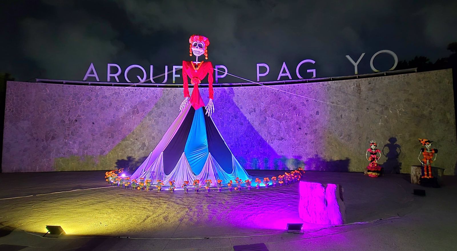 Acapulco, Gro., 01 de noviembre de 2024.- Como parte de las tradiciones mexicanas que recuerdan a quienes ya partieron de este mundo, el Parque Papagayo colocó en la explanada principal una Catrina gigante como ofrenda monumental de este centro recreativo, en el marco de las festividades por el Día de Muertos.
