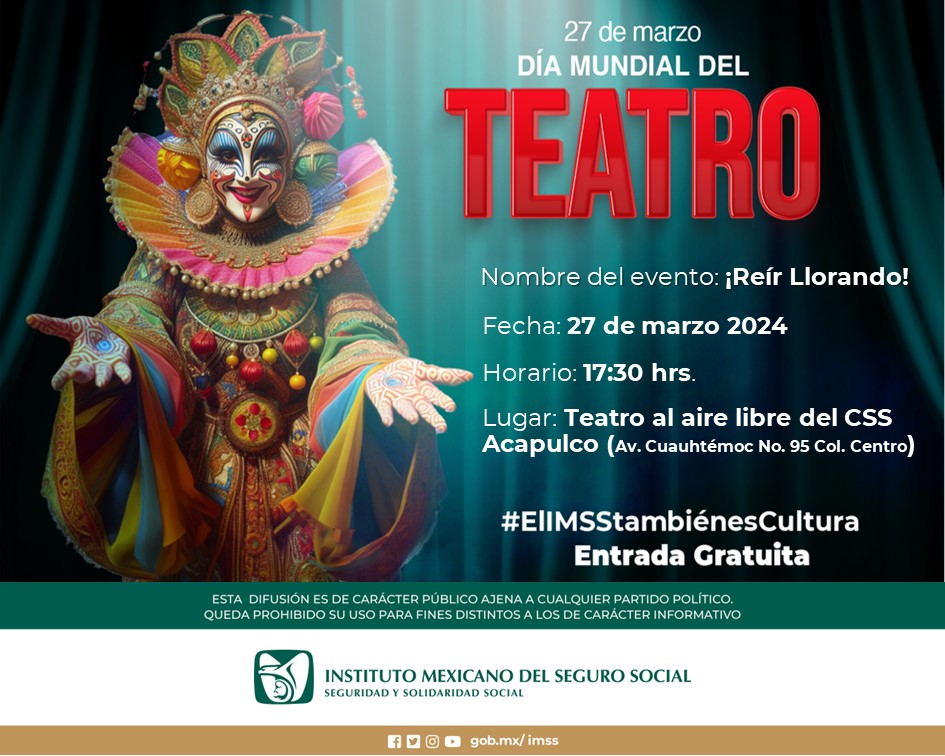 Acapulco, Guerrero 25 de marzo de 2024.- Por el Día Mundial del Teatro, que se conmemora el 27 de marzo, el Instituto Mexicano del Seguro Social (IMSS) en Guerrero llevará a cabo actividades culturales en el teatro del Centro de Seguridad Social (CSS) de Acapulco.