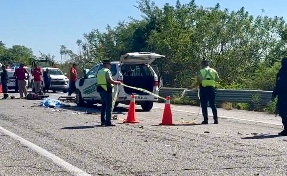 El impacto se dio entre un vehículo de la marca Toyota, tipo Avanza, con cromática de taxi marcado con el número económico 09 del servicio público y una motocicleta cuyo conductor murió y su cuerpo quedó tirado sobre la carpeta asfáltica.
