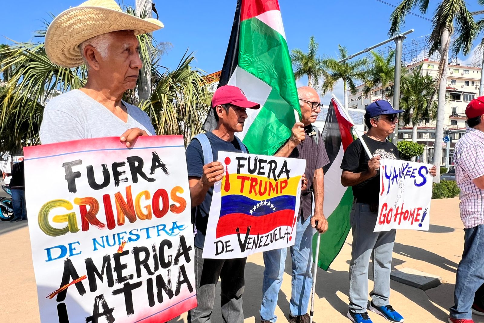 Acapulco; Gro,. A 8 de enero del 2026.- Un grupo de ciudadanos se manifestó en el monumento a Benito Juárez ubicado en el Malecón del puerto de Acapulco, para expresar su respaldo al pueblo de Venezuela y rechazar lo que calificaron como una intervención militar de Estados Unidos motivada por la apropiación de recursos.