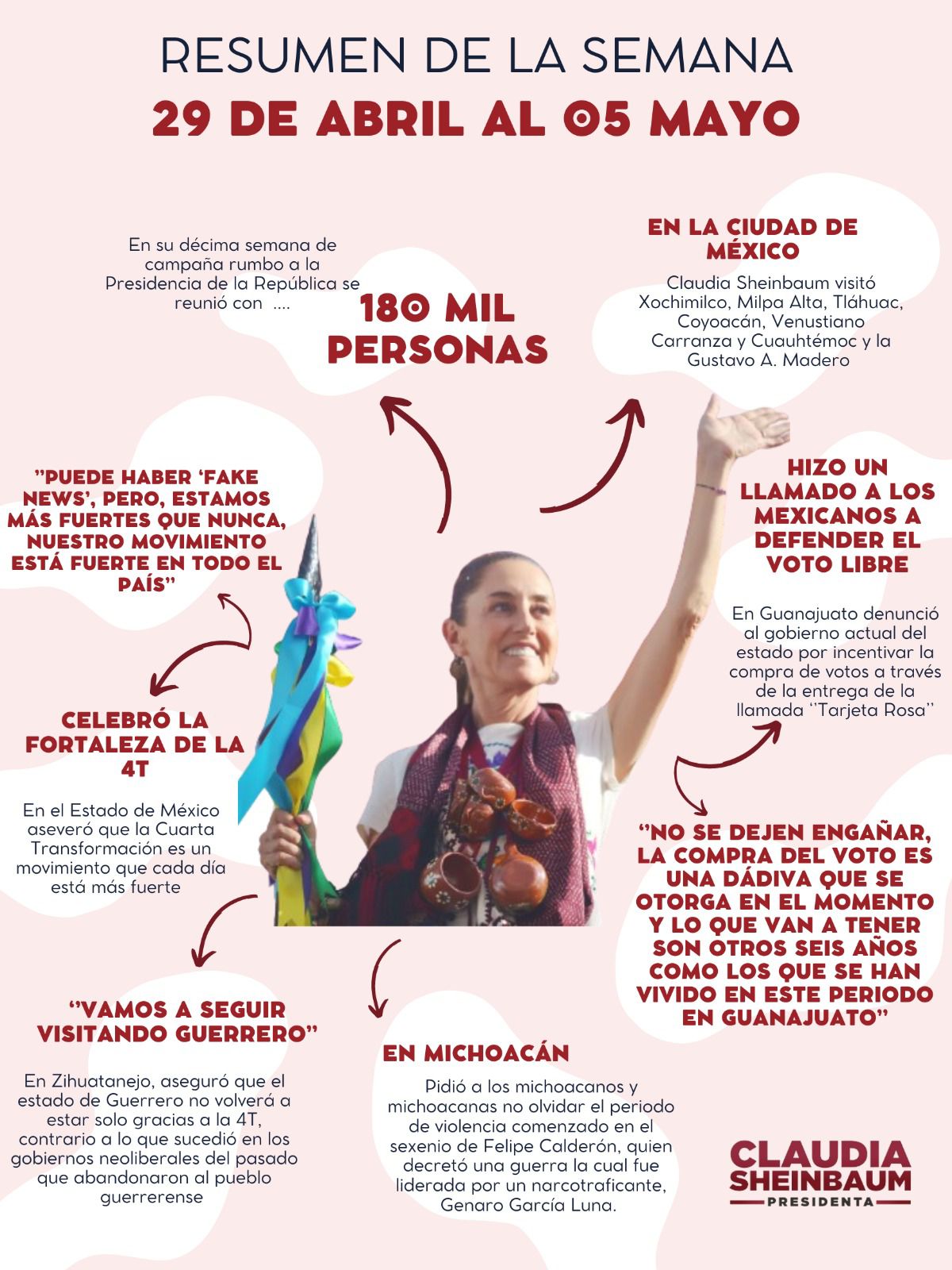 - En su décima semana de campaña, Claudia Sheinbaum visitó 11 municipios del Estado de México, de Michoacán, Guerrero y Guanajuato, así como 7 alcaldías de la Ciudad de México