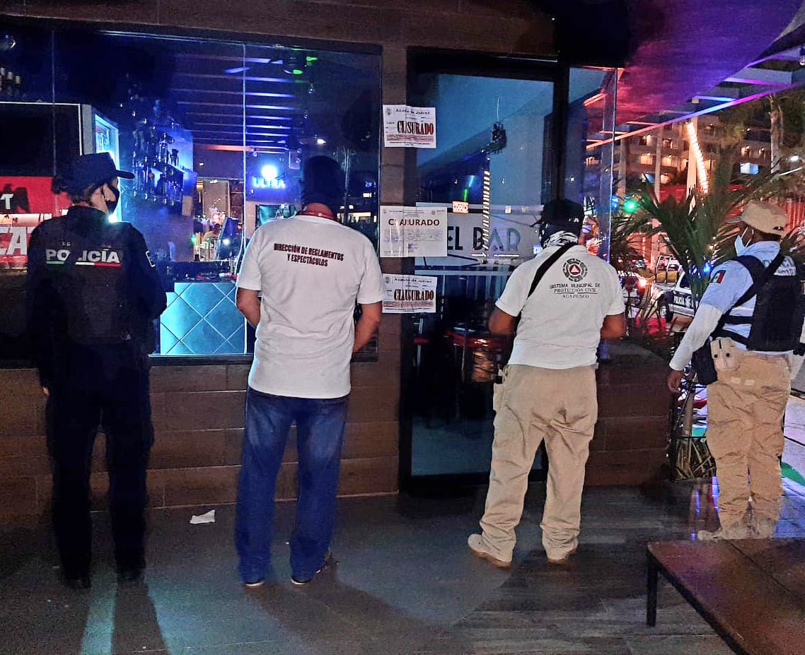 Acapulco, Gro., 29 de enero de 2021.- Un total de cuatro establecimientos fueron clausurados durante los operativos nocturnos que autoridades del Gobierno de Acapulco efectúan en bares, cantinas y restaurantes para constatar el cumplimiento de las nuevas medidas sanitarias en esta fase roja del semáforo epidemiológico.
