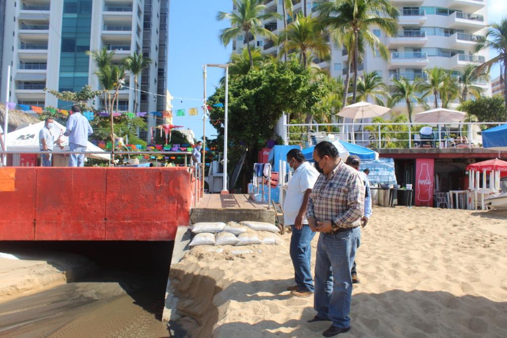 Acapulco, Gro., 05 de enero de 2021.- Personal operativo de la Comisión de Agua Potable y Alcantarillado del Municipio de Acapulco (Capama) realiza recorridos en las salidas de cauces pluviales sobre la franja de arena, supervisiones que tienen el objetivo de detectar descargas clandestinas e impedir el taponamiento en las desembocaduras de las cuencas naturales.