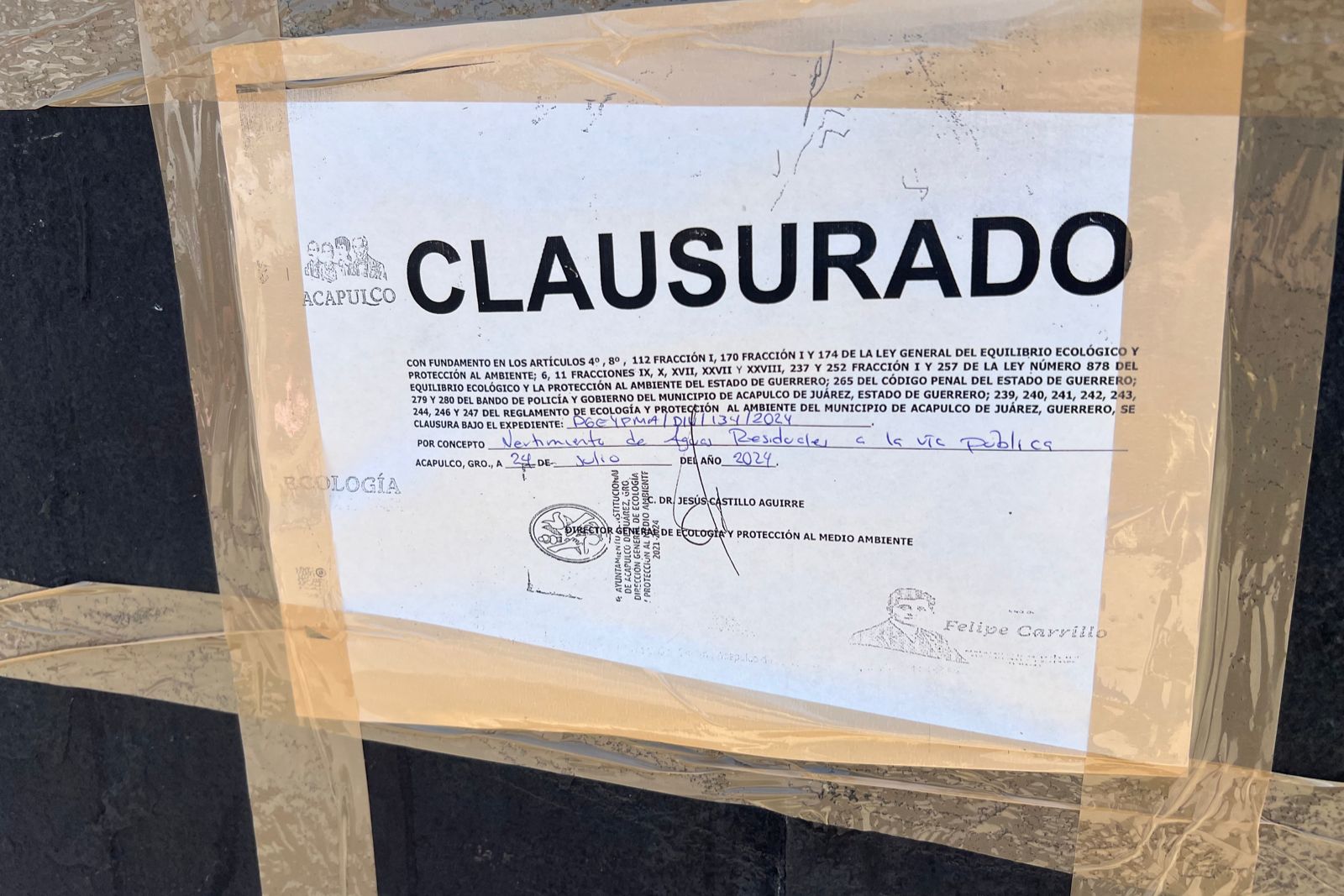 Acapulco; Gro.- Luego de que se diera a conocer a través de redes sociales un video donde fue captado un escurrimiento de aguas residuales por parte del Hotel Emporio, este día personal de Ecologia Municipal colocó sellos de clausura en las puertas del hotel.
