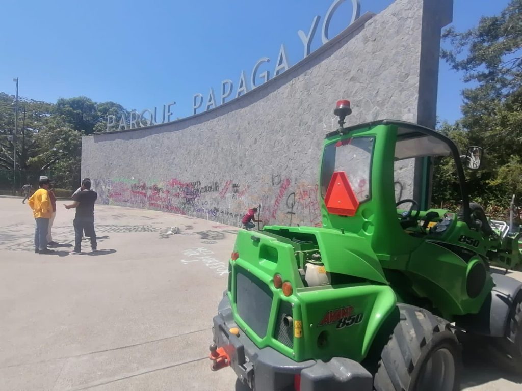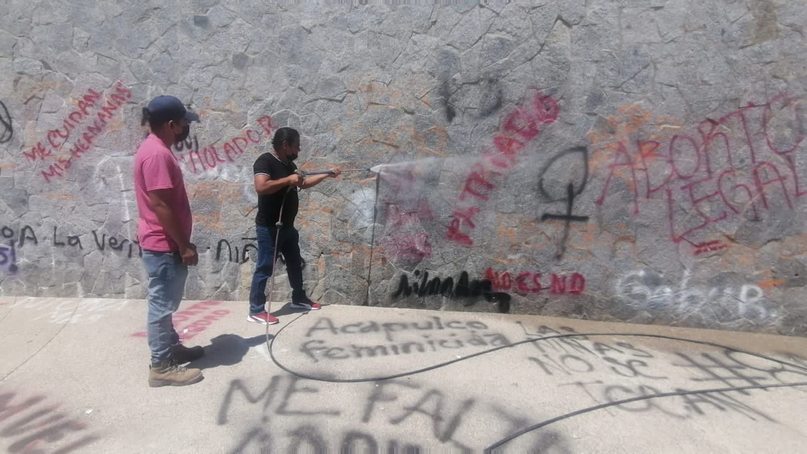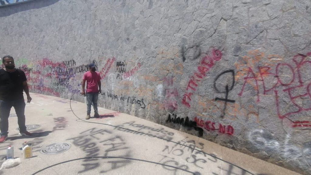Acapulco, Gro., a 15 de marzo del 2021.- Cerca del mediodía de este lunes dieron inicio los trabajos de limpieza en la fachada principal del Parque Papagayo para así retirar las pintas realizadas por feministas durante su marcha el pasado 8 de marzo.
