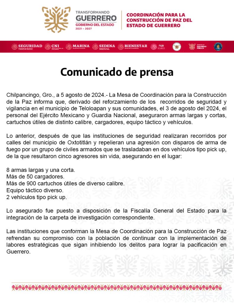 Lo anterior, después de que las instituciones de seguridad realizarán recorridos por calles del municipio de Oxtotitlán y repelieran una agresión con disparos de arma de fuego por un grupo de civiles armados que se trasladaban en dos vehículos tipo pick up, de la que resultaron cinco agresores sin vida, asegurando en el lugar: