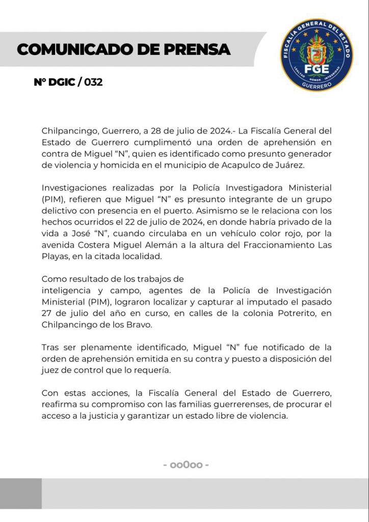Chilpancingo, Guerrero, a 28 de julio de 2024.- La Fiscalía General del Estado de Guerrero cumplimentó una orden de aprehensión en contra de Miguel “N”, quien es identificado como presunto generador de violencia y homicida en el municipio de Acapulco de Juárez.