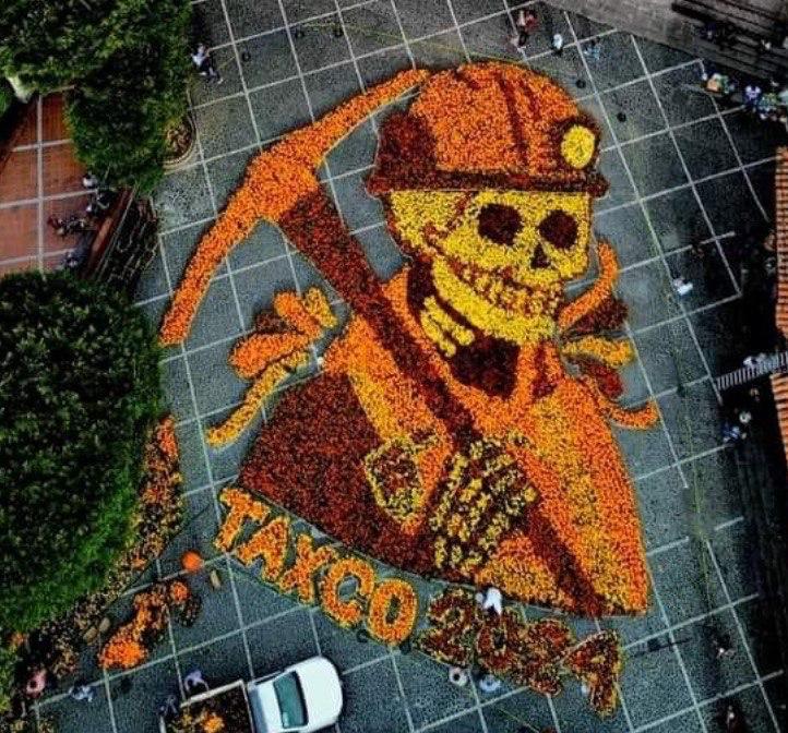 Esta impresionante imagen, colocada al pie de la majestuosa Parroquia de Santa Prisca y San Sebastián, está realizada con flores de Cempasúchil, y es un homenaje especial a la lucha de los mineros, pero también a todas aquellas personas que hicieron a Taxco grande a través de la minería.
