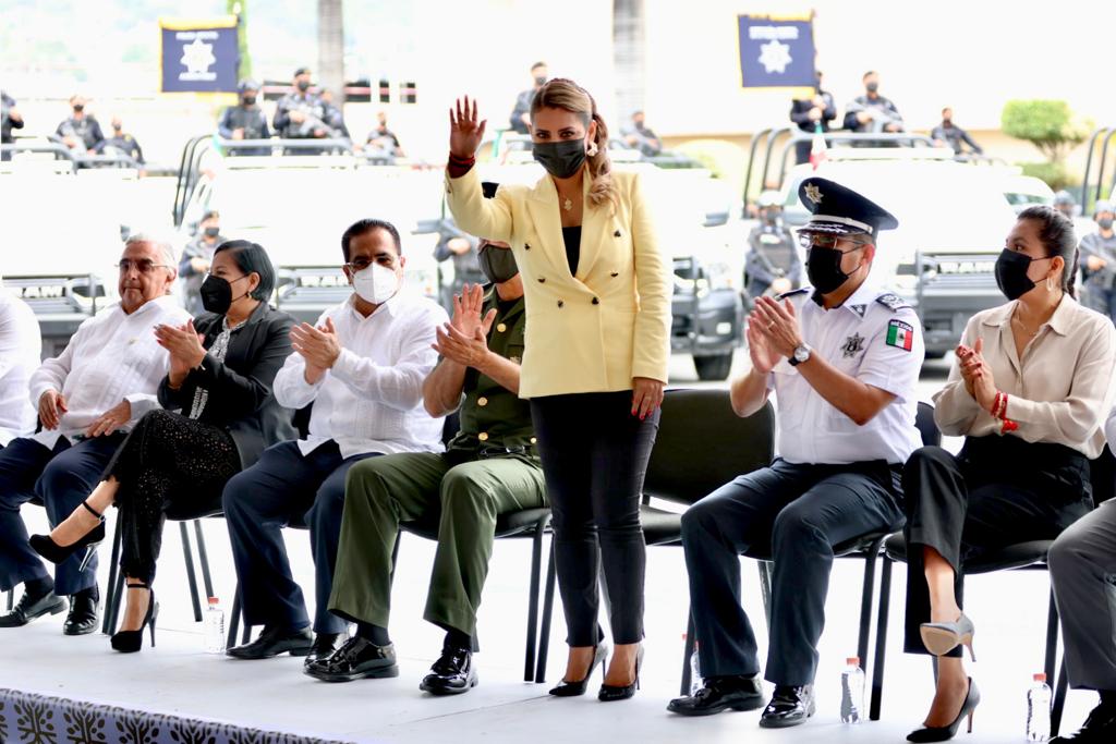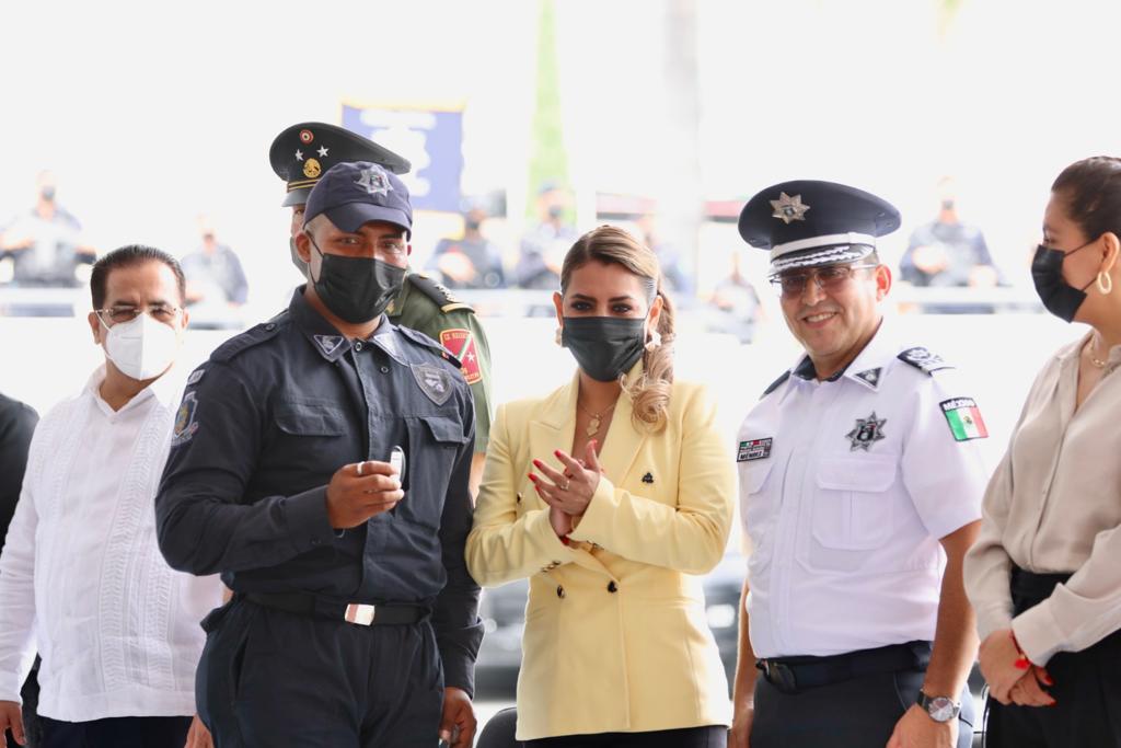 En el evento, la gobernadora, también entregó cinco patrullas nuevas y 92 equipos de radio comunicación al Instituto de la Policía Auxiliar del Estado, que se adquirieron con recursos propios de esta administración con una inversión de 2.8 millones de pesos.